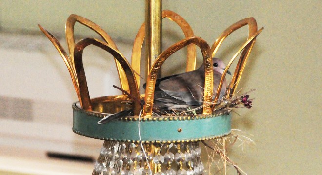 NEVŞEHİR'de caminin açık penceresinden içeriye giren kumru kuşu, avizeye yuva yaptı.