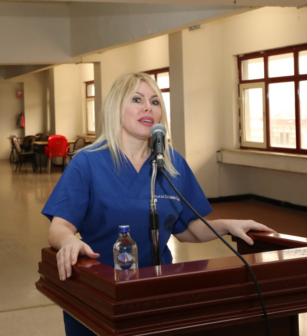 Rektör Özkan, hastane çalışanı Necibe Evrim Tongül'e günün anısına çiçek takdim etti. Rektör Özkan daha sonra katılımcılarla bir süre sohbet etti.