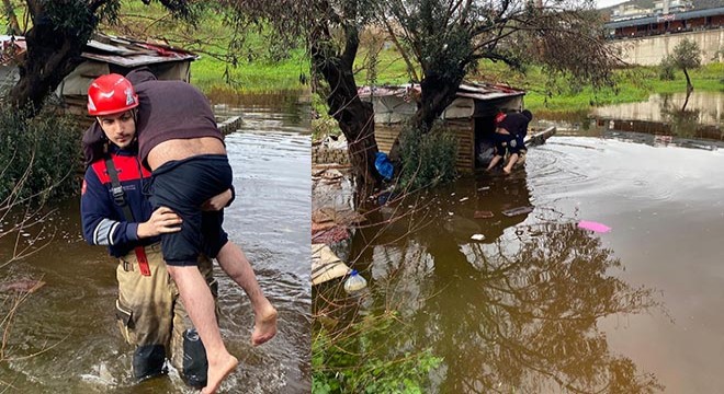 İZMİR'in Karşıyaka ilçesi Örnekköy Mahallesi’nde etkili olan sağanak yağış nedeniyle su seviyesinin yükseldiği boş arazideki barakada mahsur kalan D.D. (56), itfaiye ekiplerince kurtarıldı. İzmir İtfaiyesi’nde görevli Alper Aksular, D.D.'yi sırtında taşıyarak sudan çıkardı.