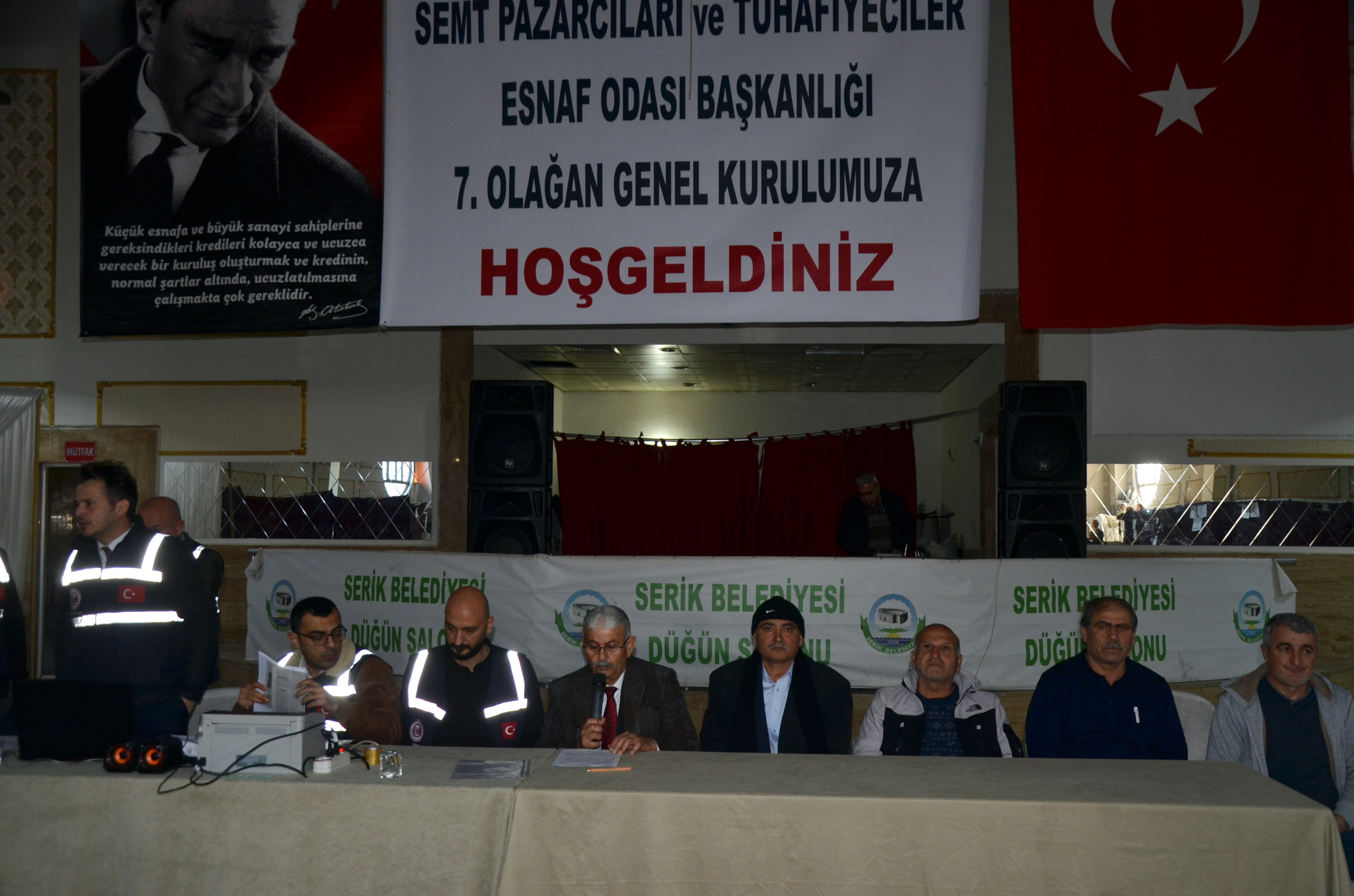 Serik Semt Pazarcılar ve Tuhafiyeciler Esnaf Odası'nın olağan kongresi Belediye Düğün Salonunda yapıldı. Divan başkanlığını Antalya Esnaf ve Sanatkarlar Odaları Birliği Yönetim Kurul Üyesi ve Manavgat Esnaf Odası Başkanı Abdullah Akça'nın yaptığı kongre saygı duruşu ve İstiklal Marşı ile başladı. Kongreye siyasi parti temsilcileri, sivil toplum kuruluş temsilcileri, oda üyeleri ve davetliler katıldı. Kongrede başkan adaylarının yaptığı selamlama konuşmalarının ardından oy kullanımına geçildi. 2 adayın yarıştığı kongrede mevcut Başkan Mevlüt Akıllı 661 oyla seçilirken, Yılmaz Erdem ise 263 oy aldı. Bu sonuçla Mevlüt Akıllı üçüncü dönemine seçildi.