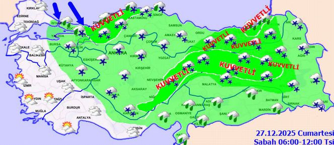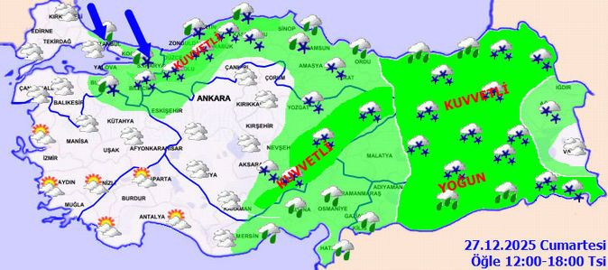 Batı Karadeniz'in yüksekleri, İç Anadolu'nun doğusu, Doğu Karadeniz'in yüksekleri, Doğu Anadolu ile Diyarbakır, Batman ve Siirt illerinin kuzey kesimlerinde kuvvetli ve yer yer yoğun kar yağışları bekleniyor.