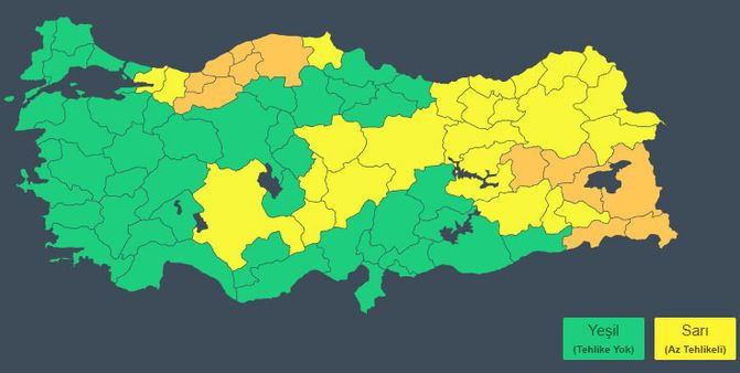 Sarı alarm verilen kentler şöyle: Ağrı, Artvin, Diyarbakır, Elazığ, Erzincan, Erzurum, Giresun, Kars, Kayseri, Kocaeli, Konya, Nevşehir, Niğde, Rize, Sakarya, Siirt, Sinop, Sivas, Trabzon, Tunceli, Yozgat, Bayburt, Batman, Ardahan ve Iğdır.