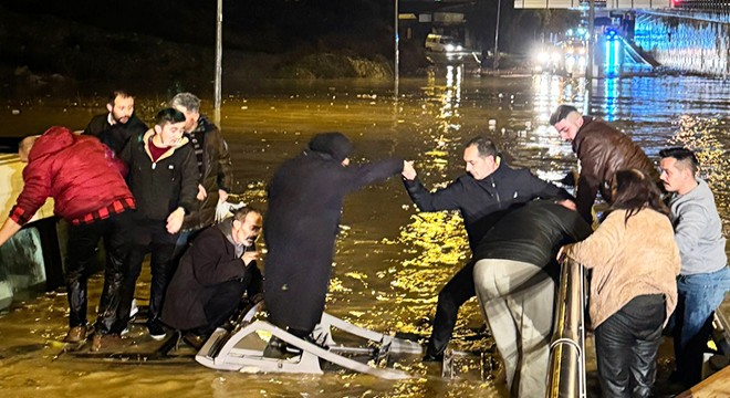 Kuşadası’nda etkili olan sağanak nedeniyle cadde ve sokaklar göle dönerken, iş yerleri ve alışveriş merkezlerinin zemin ve bodrum katlarını su bastı. Saat 22.00 sıralarında ilçe merkezinde seyir halinde olan şehir içi yolcu minibüsü de Kuşadası Ticaret Odası önünde suya gömüldü. Motoru arızalanan minibüs hareket edemezken bir süre sonra yağmur suyu içeriye dolmaya başladı. Yarısından fazlası suya gömülen ve içerisinde 20 kişinin bulunduğu minibüstekiler 112 Acil Çağrı Merkezini arayarak yardım istedi. Minibüste mahsur kalan yolculara çevredeki vatandaşlar ile olay yeri yakınında bulunan AKUT Kuşadası ekip lideri Tağmaç Saraçoğlu yardım eli uzattı. Yolcular, bir iş yerinden getirilen şezlong ve tahta kapıların yardımıyla yol kenarındaki bariyerlere çıkarıldı.