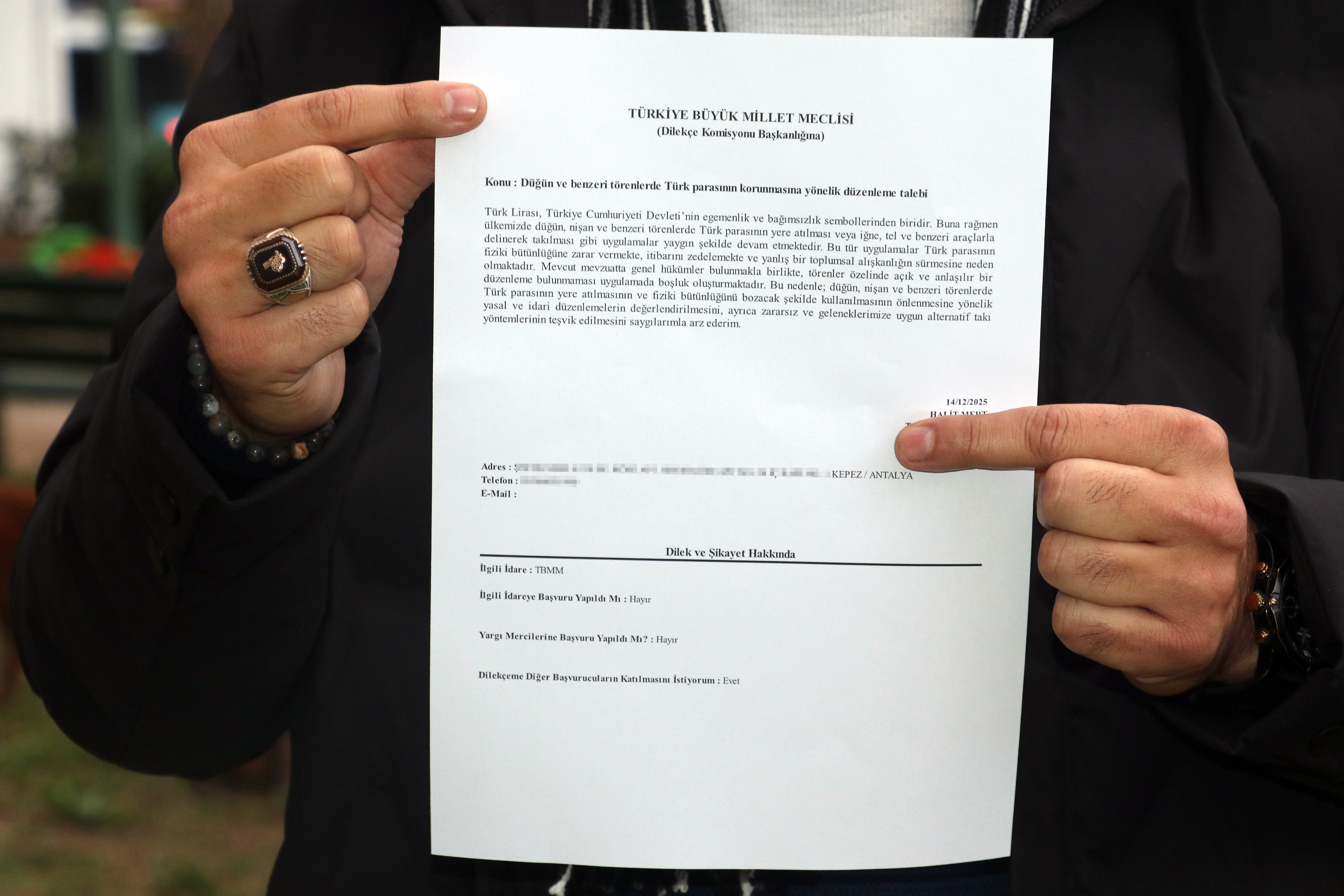 Antalya'da yaşayan ve Türk lirasının manevi değerinin düğünlerdeki takı törenlerinde yapılan yanlış uygulamalarla zarar gördüğünü söyleyen Halit Mert, TBMM Dilekçe Komisyonu'na e-Devlet üzerinden başvuruda bulundu. Halit Mert dilekçesinde düğün, nişan ve benzeri törenlerde Türk lirasının delinmesi, yere atılması ve farklı şekillerde kullanılması gibi uygulamaların paranın fiziki bütünlüğüne ve manevi değerine zarar verdiğini belirterek, bu konuda yasal düzenleme yapılmasını talep etti.