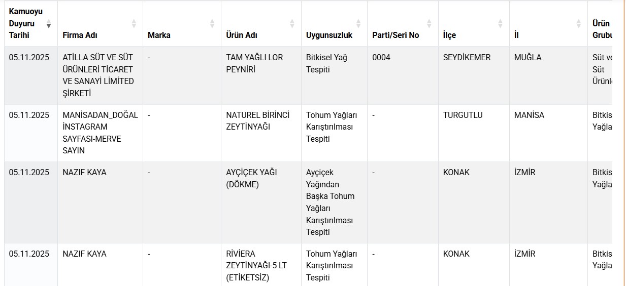Listeye biri sağlığı tehlikeye düşürecek ürün olmak üzere toplam 18 yeni ürün daha eklendi. Listede zeytinyağı, ayçiçek yağı ve lor peyniri gibi ürünler yer aldı. Yapılan son testlerde, bazı markaların ‘tam yağlı lor peyniri’ ibaresiyle sattığı üründe bitkisel yağ olduğu belirlendi. Zeytinyağı ürünlerinde de taklit veya tağşiş tespiti yapıldı. Bitkisel karışım yağda ise gıdada kullanımına izin verilmeyen boya olduğu belirlendi.
