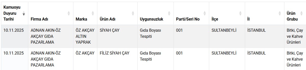 Tarım ve Orman Bakanlığı, gıda ürünlerinde taklit ve tağşiş yapan markaları 'guvenilirgida.tarimorman.gov.tr' internet adresinden açıklıyor. Sitede 'Sağlığı Tehlikeye Düşürecek Gıdalar' ile 'Taklit ve Tağşiş Yapılan Gıdalar' başlıkları altında taklit ve tağşiş yaparak sağlığı tehlikeye düşüren firmalar, markalar ve ürünler yer alıyor. Listeye biri sağlığı tehlikeye düşürecek ürün olmak üzere toplam 3 yeni ürün daha eklendi. Listede siyah çay ve macun gibi ürünler yer aldı. Son testlerde, bazı markaların 'siyah çay' ibaresiyle sattığı üründe gıda boyası olduğu, macunda ilaç etken maddesi bulunduğu belirlendi.