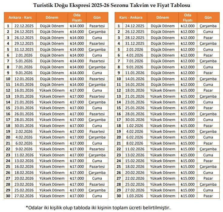 Bu sezonda da Turistik Doğu Ekspresi bilet fiyatları TCDD tarafından yataklı vagon için 2 dönem olarak açıklandı. Ankara-Kars yönlü seferlerde düşük dönemde (22.12.2025-14.01.2026) bilet fiyatları bir ya da iki kişi fark etmeden 14.000 TL (gidiş-dönüş 26.000) olurken, yüksek dönem için de (16.01.2026-27.02.2026) 17.000 TL (gidiş-dönüş 33.000) olarak belirtildi.
