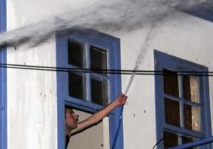 Antalya'da tarihi Kaleiçi'nde kullanılmayan bina henüz belirlenemeyen bir nedenle çıkan yangına bir vatandaş, evinden müdahale etmeye çalıştı.