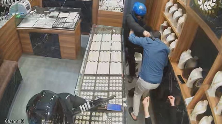 SULTANGAZİ’de çaldıkları motosikletle gittikleri kuyumcuyu soymaya çalışan 2 şüpheli tutuklandı. Motosiklet kaskı takan iki şüphelinin kuyumcuya girip iş yeri sahibini darbettikten sonra kaçtığı anlara ait yeni görüntüler ortaya çıktı.